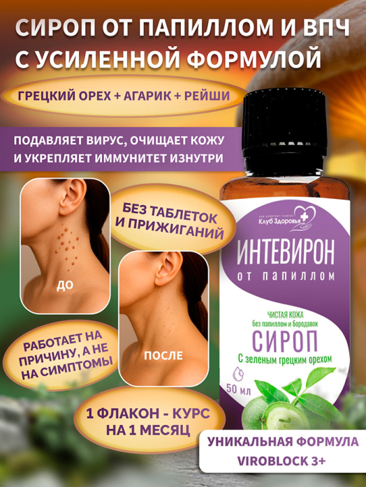 Фокус на задаче «от папиллом». Подходит при одиночных и множественных папилломах на коже и слизистых; поддерживает иммунный ответ и чистоту кожных покровов.